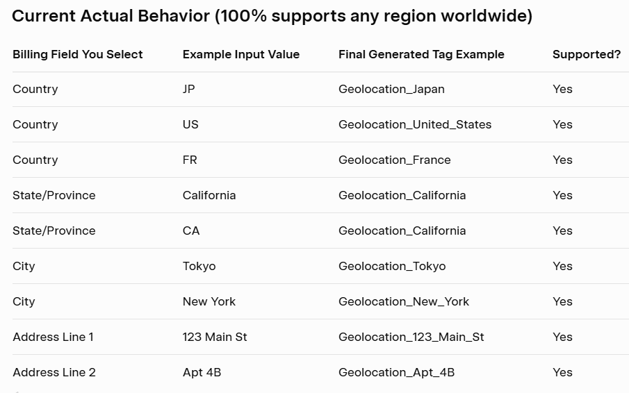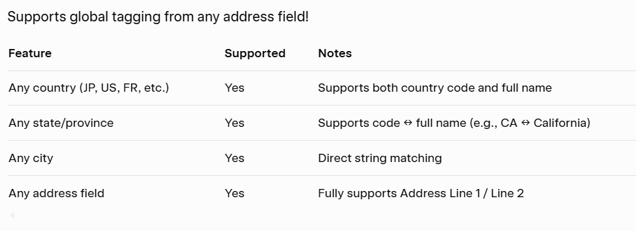 9. Geolocation: Based on billing fields (e.g., country, state), it tags customers matching a set value (default: “TW” for Taiwan). Tags like “Geolocation_Taiwan” support localized marketing, such as region-specific promotions.